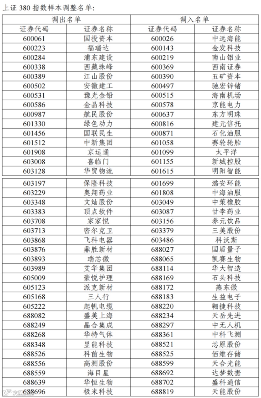 上证380指数样本股调入中远海能、金发科技、南山铝业、西南证券、五矿资本、驰宏锌锗、海南机场、京能电力、东方明珠、建元信托、石化油服等38只个股,调出国投资本、福瑞达、浦东建设、西藏珠峰、江山股份、安徽建工、豫光金铅、金晶科技、航民股份和绿色动力等38只个股。