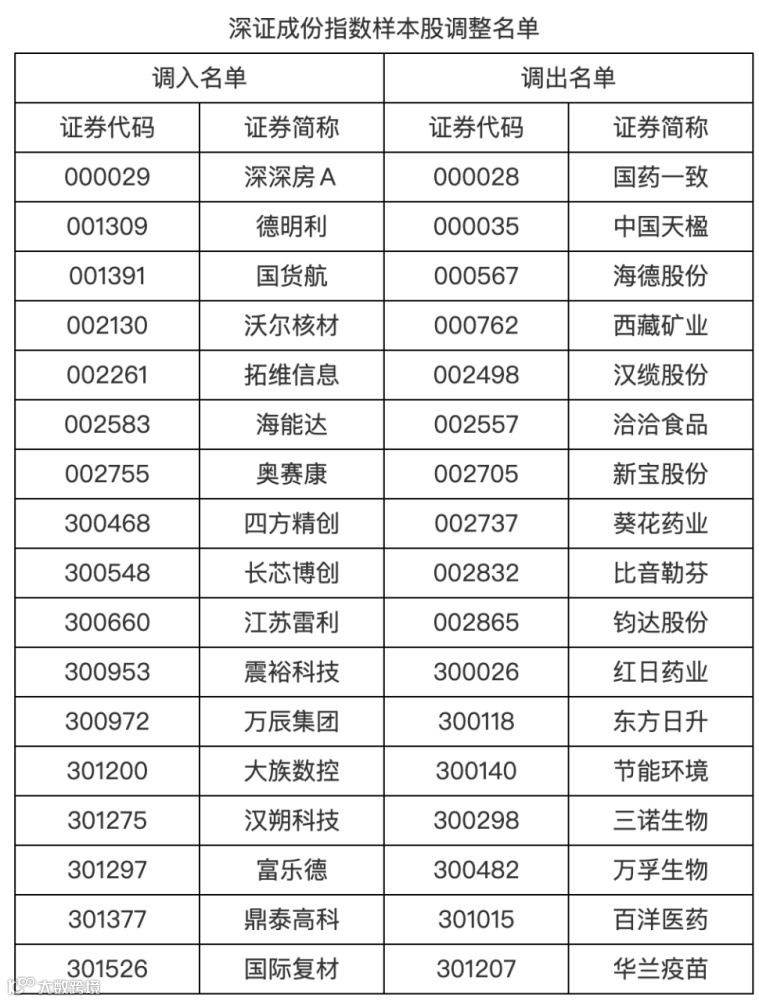 具体来看,深证成指样本股调入深深房A、德明利、国货航、沃尔核材、拓维信息等17只个股,调出国药一致、中国天楹、海德股份、西藏矿业、汉缆股份等17只个股。