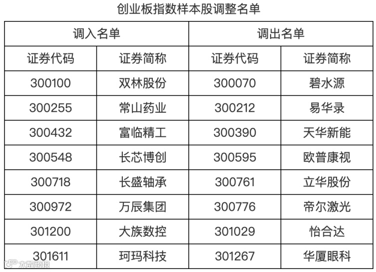 创业板指数样本股调入了双林股份、常山药业、富临精工等8只个股,调出碧水源、易华录、天华新能等8只个股。