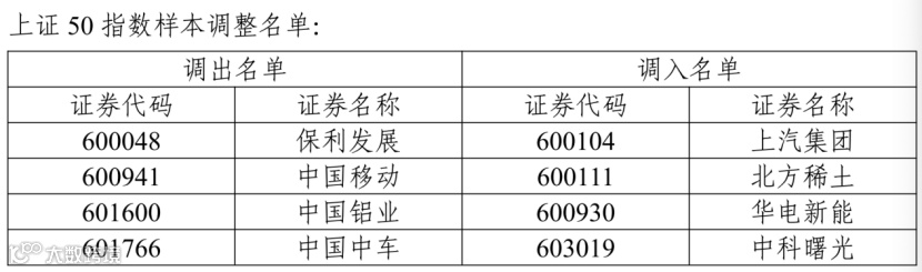 具体来看,上证50指数样本股调入上汽集团、北方稀土、华电新能和中科曙光,调出保利发展、中国移动、中国铝业和中国中车。
