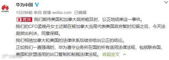 华为也及时作出了回应。华为表示,孟晚舟女士近期在被加拿大当局代表美国政府暂时扣留之后,今天法庭做出判决,同意保释。华为相信加拿大和美国的法律体系后续会给出公正的结论。正如华为一直强调的,华为遵守业务所在国的所有适用法律法规,包括联合国、美国和欧盟适用的出口管制和制裁法律法规。华为期待美国和加拿大政府能及时、公正的结束这一事件。