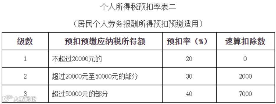 劳务报酬所得、稿酬所得、特许权使用费所得,以每次收入额为预扣预缴应纳税所得额,计算应预扣预缴税额。劳务报酬所得适用个人所得税预扣率表二,稿酬所得、特许权使用费所得适用百分之二十的比例预扣率。