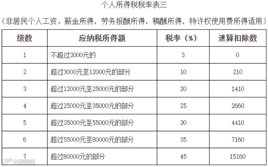 非居民个人的工资、薪金所得,以每月收入额减除费用五千元后的余额为应纳税所得额;劳务报酬所得、稿酬所得、特许权使用费所得,以每次收入额为应纳税所得额,适用个人所得税税率表三计算应纳税额。劳务报酬所得、稿酬所得、特许权使用费所得以收入减除百分之二十的费用后的余额为收入额。其中,稿酬所得的收入额减按百分之七十计算。