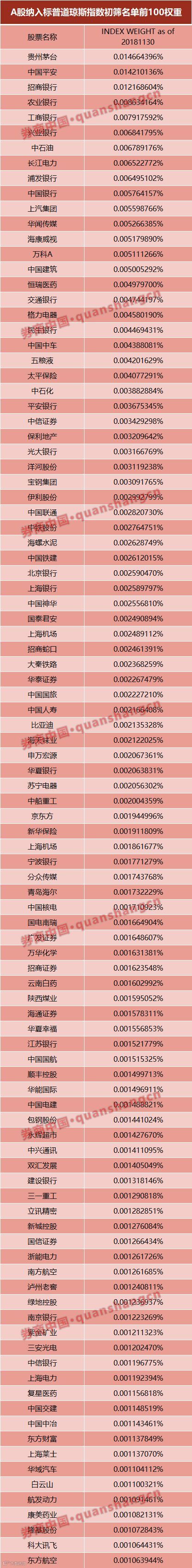本次进入标普道琼斯指数初筛名单的权重最高的50只股票分别是贵州茅台、中国平安、招商银行等,其中有19只为金融股。