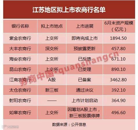 数据显示,除了苏南5家上市农商行,以及即将上市的紫金农商行外,江苏地区还有至少7家拟上市农商行。