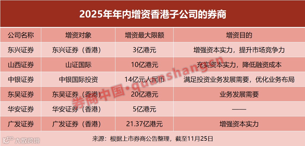 据券商中国记者梳理上市券商公告,年内东兴证券、山西证券、中银证券、东吴证券、华安证券、广发证券都(拟)对香港子公司进行增资,增资金额最高达21.37亿港元,至少也有3亿港元。