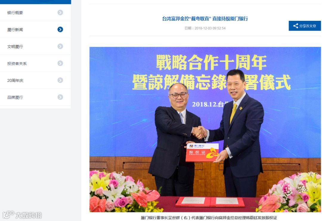 12月3日,厦门银行官网披露,台湾富邦金控首次以直接股东的身份入股厦门银行,并与厦门银行在中国台北签署战略合作备忘录。