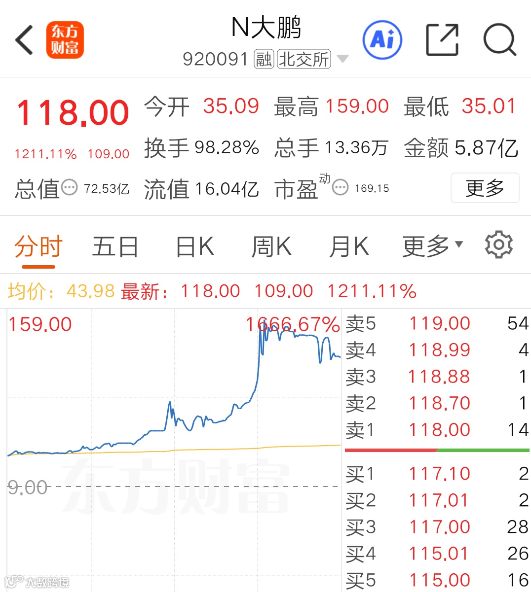 11月21日,大鹏工业在北交所上市,开盘后,股价直线拉升,盘中一度暴涨1666.67%,触发二次临停,截至收盘,涨幅为1211.11%,成交金额为5.87亿元,换手率超98%,总市值升至72.53亿元。