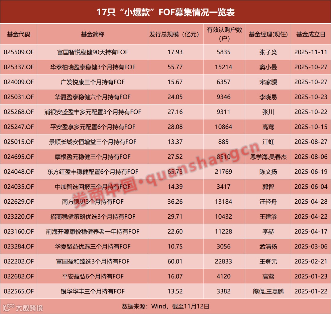包括该产品在内,今年以来成立的FOF数量和规模分别超过60只和560亿元(2024年分别只有35只和106.19亿元),其中募集规模在10亿元以上的“小爆款”FOF有17只。