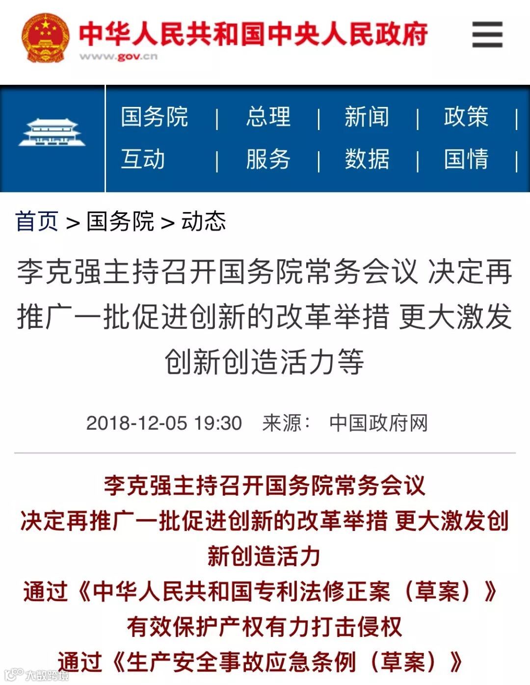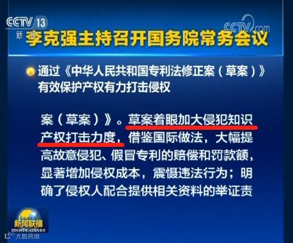 国务院常务会议明确,要进一步加强专利权人合法权益保护、完善激励发明创造的机制制度、把实践中有效保护专利的成熟做法上升为法律,会议通过《中华人民共和国专利法修正案(草案)》。草案着眼加大对侵犯知识产权的打击力度,借鉴国际做法,大幅提高故意侵犯、假冒专利的赔偿和罚款额,显著增加侵权成本,震慑违法行为;明确了侵权人配合提供相关资料的举证责任,提出网络服务提供者未及时阻止侵权行为须承担连带责任。草案还明确了发明人或设计人合理分享职务发明创造收益的激励机制,并完善了专利授权制度。会议决定将草案提请全国人大常委会审议。