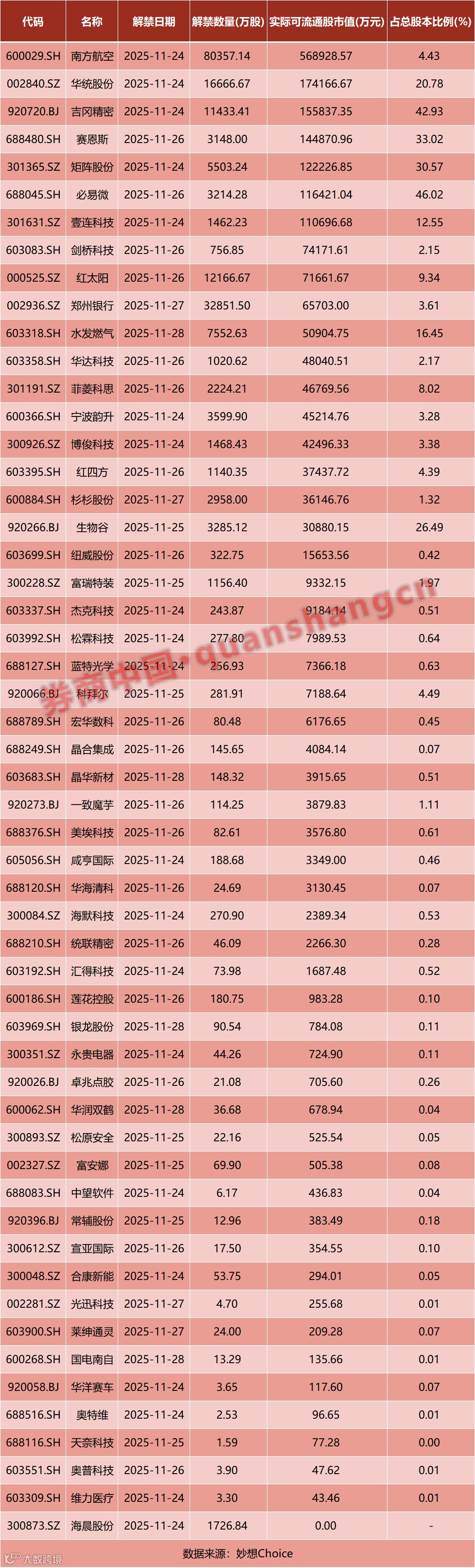 从解禁市值来看,解禁市值居前三位的是:南方航空(56.89亿元)、华统股份(17.42亿元)、吉冈精密(15.58亿元)。