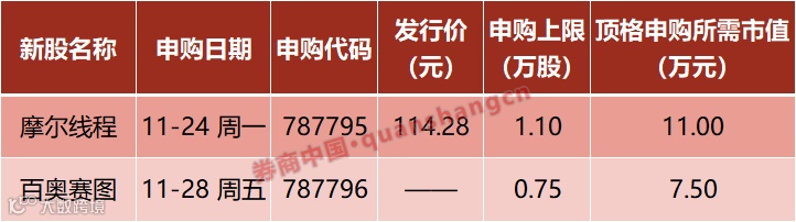 本周(11月24日—11月28日)有2只新股发行。周一:摩尔线程;周五:百奥赛图。摩尔线程是国产GPU龙头,上市后将成为“国产GPU第一股”。摩尔线程的发行价为114.28元/股,是今年以来发行价最高的新股,中一签需缴款57140元。摩尔线程的网上发行申购上限为11000股,顶格申购需配沪市市值11万元。摩尔线程本次发行后总股本为4.7亿股,按114.28元/股的发行价计算,上市时总市值将达537亿元。