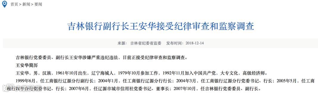 12月14日,吉林省纪委监委发布消息称,吉林银行党委委员、副行长王安华涉嫌严重违纪违法,目前正接受纪律审查和监察调查。