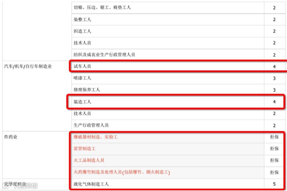 4级以及以上的职业或者拒保职业如炸药行业、电缆行业工人: