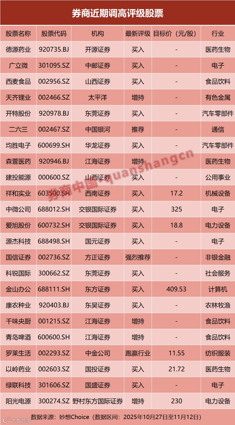 整体来看,被上调评级的公司大多具备业绩增长强劲、技术壁垒较高或行业景气度提升的特点。许多企业在2025年第三季度表现出收入或利润的显著增长,部分公司因新产品放量、订单饱满或政策利好而获得机构青睐。