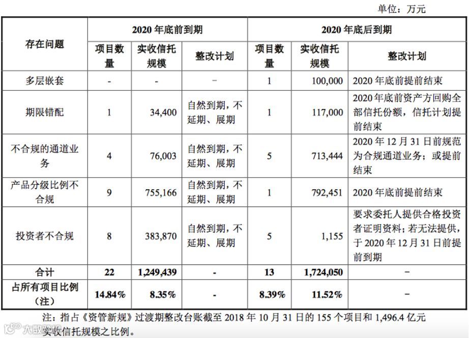 而对于2020年底后到期、需提前结束的信托产品,贡献收入占比为营业收入的2.66%,其中不涉及产品分级比例不合规的产品。