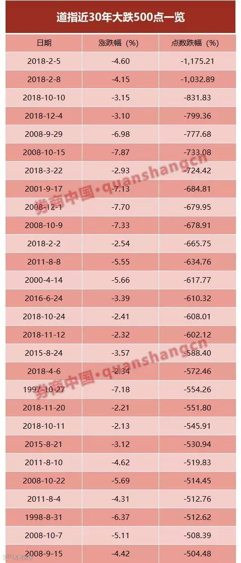 据券商中国记者统计,近30年来,道指大跌500点的次数共有28次,其中点位跌幅前四的均发生在2018年,分别是2月5日(跌1175.21点)、2月8日( 跌1032.89点)、10月10日(跌831.83点)、12月4日(跌799.36点)。值得注意的是,4日盘中道指一度大跌逾800点,系美股史上第4次超800点大跌。