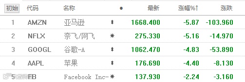 科技股依然是重挫主力,美股FAANG五大科技股全线下跌,亚马逊、奈飞跌逾5%,谷歌、苹果跌逾4%,Facebook跌2.24%,市值累计一日蒸发1400亿美元。