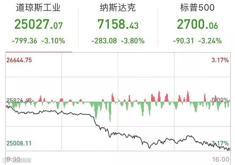 周二收盘,美股全线重挫,三大股指跌幅均超过3%,道指暴跌约800点,跌幅达3.1%;纳指重挫逾283点,跌3.8%,连续跌穿7400、7300、7200三个整数关口;标普500收跌3.2%。