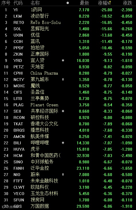 中概股多数收跌,1药网大跌25%,凌动智行、优信、拍拍贷等6股跌幅超过10%,哔哩哔哩、蔚来汽车、虎牙等25股跌幅超过6%,此外,百度跌4.53%,阿里巴巴跌3.3%,拼多多跌2.71%,京东跌2.54%。