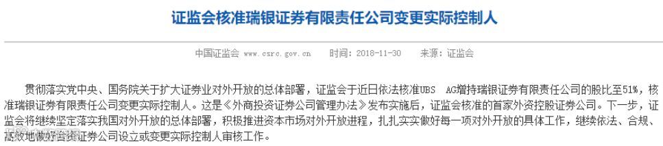 证监会官方消息称,贯彻落实党中央、国务院关于扩大证券业对外开放的总体部署,证监会于近日依法核准UBS AG增持瑞银证券有限责任公司的股比至51%,核准瑞银证券有限责任公司变更实际控制人。这是《外商投资证券公司管理办法》发布实施后,证监会核准的首家外资控股证券公司。