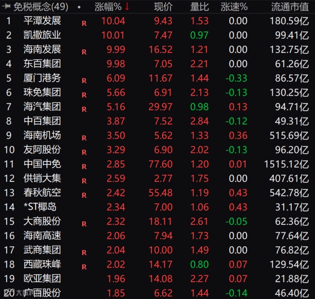 值得关注的是,近期,免税概念股多日大涨,这跟免税店政策11月起“升级”的消息有关。今日,免税概念板块大涨超2%,平潭发展、凯撒旅游、海南发展、东百集团涨停,中国中免涨近3%。