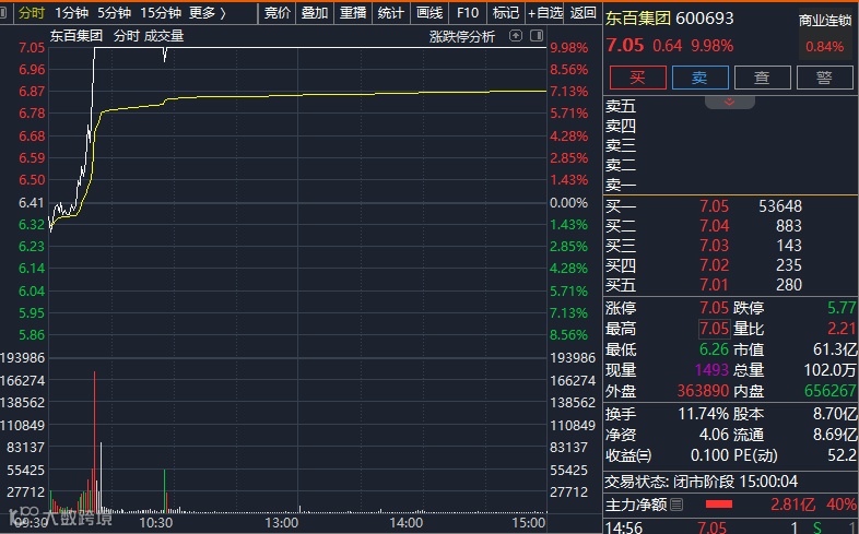 今日盘中,酒店餐饮、旅游、商业连锁、免税等大消费板块集体走强。其中,东百集团、凯撒旅业直线拉升至涨停,海南发展、平潭发展随后也涨停,珠免集团、云南旅游、中国中免、中百集团、首旅酒店、友阿股份等纷纷拉升。
