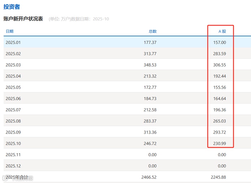 受今年10月国庆中秋假期和股市震荡影响,A股新开户数环比小幅回落。