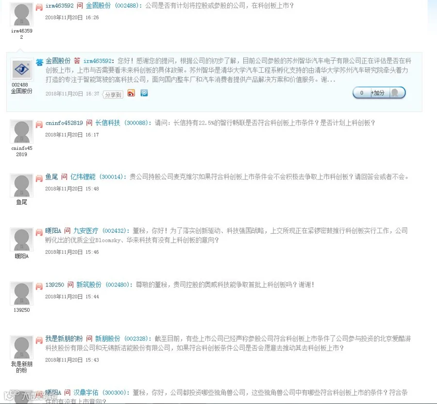 其中瀚叶股份、金固股份等董秘都做出了回复。例如,金固股份回复称,目前公司参股的苏州智华汽车电子有限公司正在评估是否在科创板上市,上市与否需要看未来科创板的具体政策。