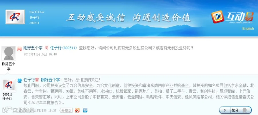 无独有偶,昨日晚间,任子行董秘在互动平台上称,公司投资设立了九合信息安全、九合文化创意、创稷投资和富海永成四家产业并购基金,投资的知名项目包括京东金融、北森云、宝宝树、猎聘网、36氪、美味不用等、永洪BI、航班管家、链家地产、美柚、瓜子二手车、青云、和创科技、易观智库、上元信安、合天智汇等;同时,上市公司参股了中新赛克、云安宝、云盈网络、明略软件、中天信安、逸风网络等公司,相关详细信息请查阅公司《2017年年度报告》。