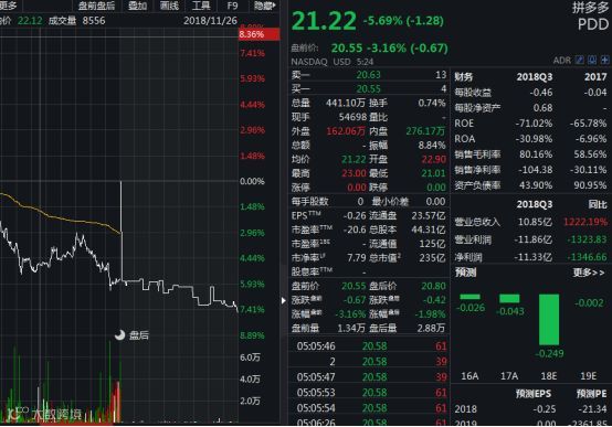 比较巧合的是,隔夜,拼多多美股下跌5.69%,报收21.22美元/股;但是拼多多股价今天继续下跌,截至记者发稿,盘前跌逾3%,两天累计跌幅近9%。