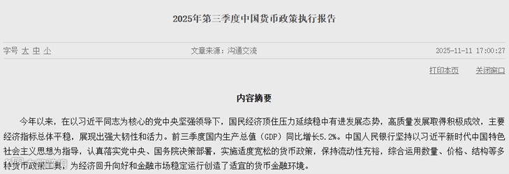 中国人民银行(下称“央行”)11月11日发布《2025年第三季度中国货币政策执行报告》(下称《报告》),总结前三季度货币政策执行情况,分析当前经济金融形势,明确下一阶段政策取向。