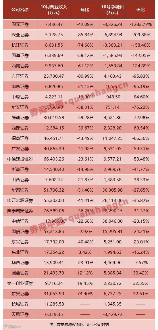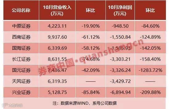 WIND数据显示,10月净利润超过1个亿的上市券商只有6家,分别是中信3.8亿、华泰3.03亿、国君2.83亿、申万宏源2.61亿、国信1.53亿、招商1.10亿元。