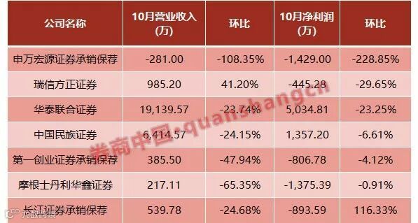 净利润方面,29家券商中有24家环比下滑,单月净利亏损的券商更多达7家。除了太平洋、东方、光大、财通、银河等券商尚未披露10月财报。