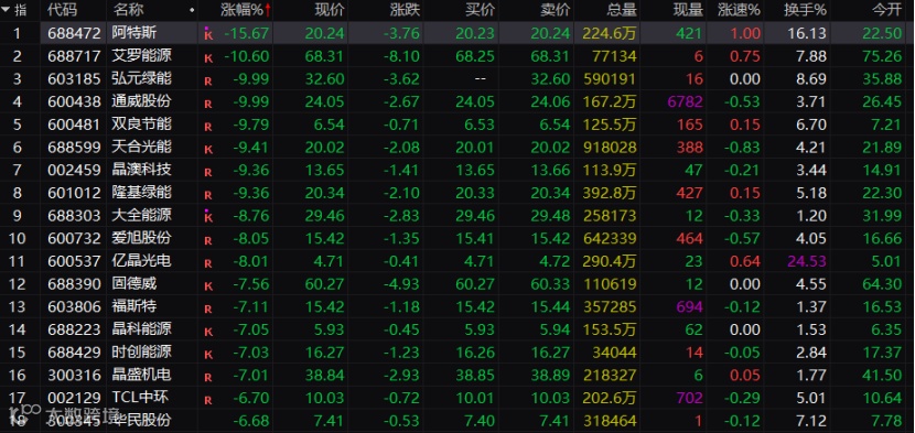 最近表现较强的光伏,今天跌疯了。阿特斯、艾罗能源、弘元绿能、通威股份、双良节能、天合光能等全线大幅走弱。