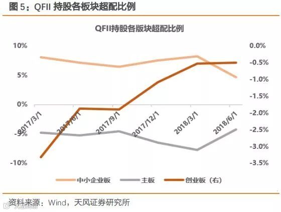 外资也表现出对创业板股票的青睐。天风证券统计数据显示,今年以来,北上资金和QFII都表现了对创业板明显的偏好。北上资金对创业板的超配比例由去年底的-4.31%提升至当前的-3.77%;QFII 对创业板的超配比例由去年底的-1.08%提升至6月末的-0.05%。主板的超配比例在今年先降后升,中小板的超配比例持续下降。天风证券表示,未来海外资金对于创业板的增配将是大势所趋。