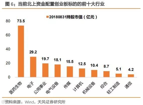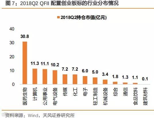 天风证券研报中提到,第一,从行业分布上看,不管是北上资金还是QFII,对于创业板中的医药类公司都显得尤为偏爱。截至2018年8月底, 北上资金和QFII对创业板医药生物类公司的持仓市值分别为73.5亿元和30.8亿元,均为其配置中持仓市值最高的行业。