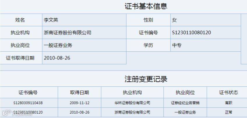 中证协资料显示,李文英2010年8月份起在浙商证券从事一般证券业务,2009年11月份取得证券经纪业务营销资格。