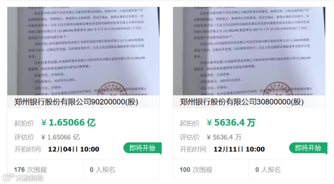 其中一笔将于12月4日起拍,为河南国原贸易有限公司持有的郑州银行9020万股,起拍价为1.65066亿元,保证金高达3000万元。