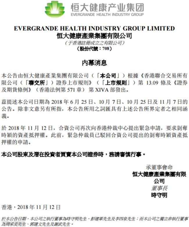 11月12日晚间,恒大健康公告称,贾跃亭向香港国际仲裁中心提出紧急仲裁申请,要求剥夺恒大的资产抵押权。这已经是贾跃亭第二次向仲裁庭申请剥夺恒大的资产抵押权,此前申请已被驳回。
