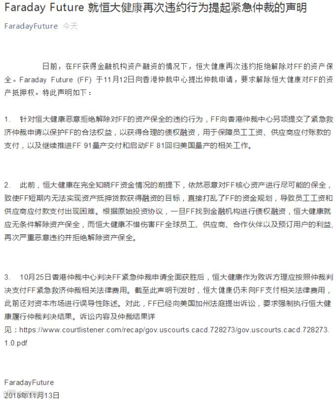 声明中称,针对恒大健康恶意拒绝解除对FF的资产保全的违约行为,FF向香港仲裁中心另项提交了紧急救济仲裁申请以保护FF的合法权益,以获得合理的债权融资,用于保障员工工资、供应商应付账款的支付,以及继续推进FF 91量产交付和启动FF 81回归美国量产的相关工作。