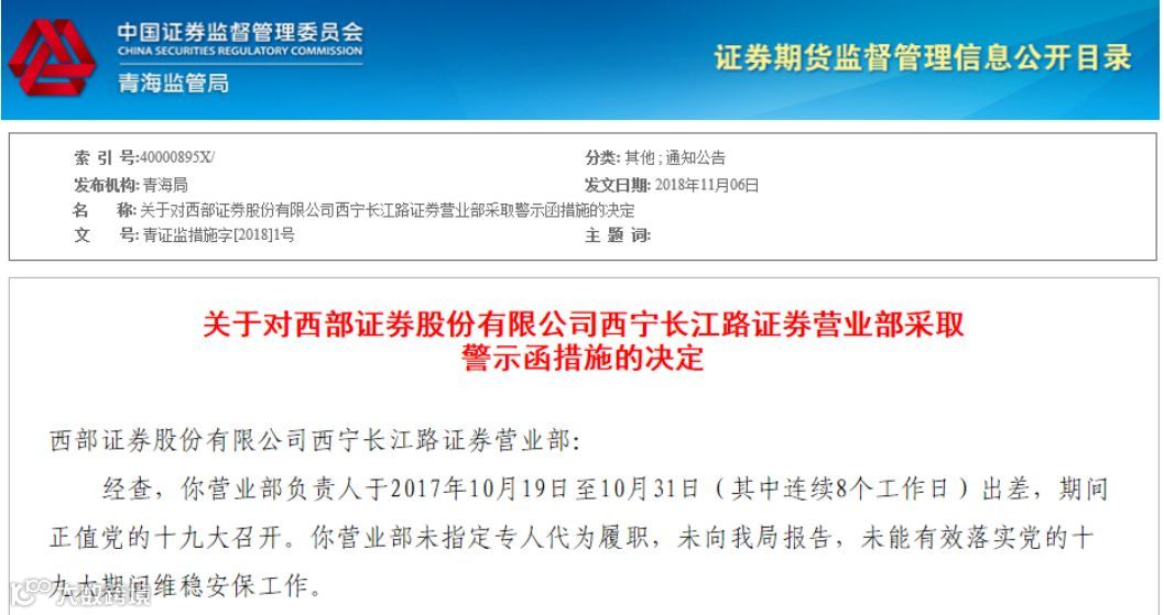 近日,西部证券西宁长江路证券营业部被出具警示函。青海证监局查明,该营业部负责人于2017年10月19日至10月31日(其中连续8个工作日)出差,期间正值党的十九大召开。且未指定专人代为履职,未能有效落实党的十九大期间维稳安保工作。上述行为违反了《证券公司分支机构监管规定》第十七条之规定。