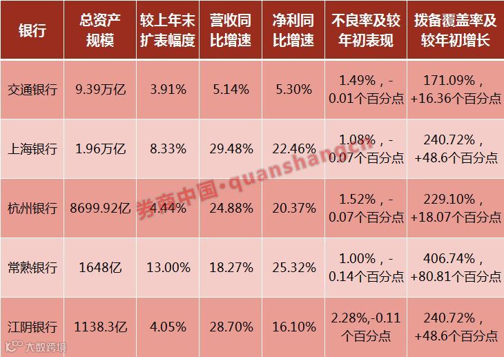 已经发布三季报的江浙沪五家行,分别是交通银行、上海银行、杭州银行、常熟银行和江阴银行。