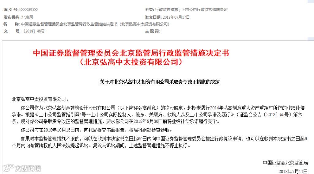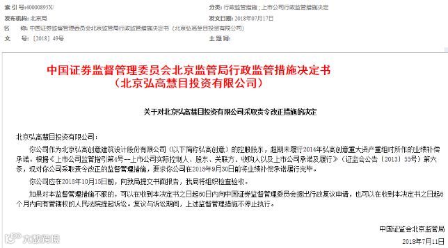券商中国记者查阅公开信息获悉,今年7月,北京证监局下分别向弘高慧目和弘高中太下发了行政监管措施决定书。北京证监局认为,弘高慧目、弘高中太超期未履行2014年弘高创意重大资产重组时所作的业绩补偿承诺。北京证监局对两家公司采取责令改正的监督管理措施,要求其在9月30日前将业绩补偿承诺履行完毕。