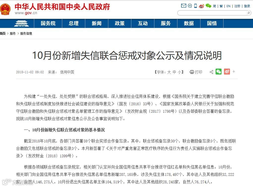 11月2日,国家公共信用信息中心发布“10月份新增失信联合惩戒对象公示及情况说明”。记者注意到受托公示黑名单信息中,本月新增因严重失信行为而限制乘坐火车严重失信人219人,限制乘坐民用航空器严重失信人5人。其中,证监会提供4人涉及逾期不履行证券期货行政罚没款缴纳义务,1人涉及上市公司相关责任主体逾期不履行公开承诺等。