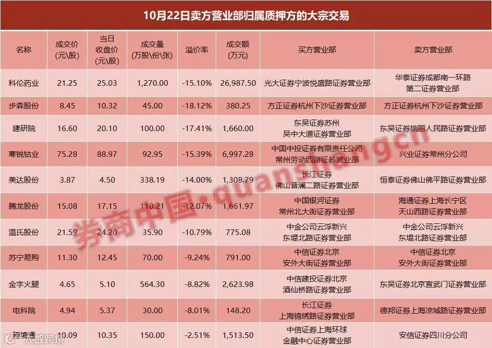 记者梳理22日成交的44宗大宗交易,其中有11只个股的卖方营业部属于该个股的质押券商之一;23日成交的30宗大宗交易,仅有2只个股的卖方营业部属于该个股质押券商之一。