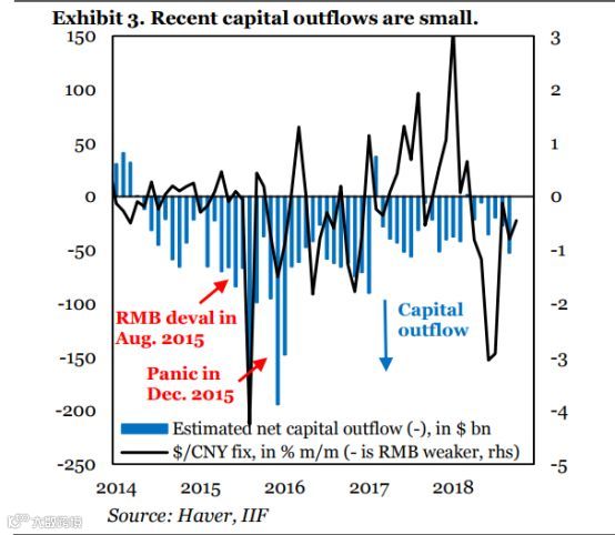 值得注意的是,尽管人民币贬值压力大,但是国内资金外流规模仍然远远低于2015年同期水平。根据国际金融协会(IIF)的统计数据来看,目前国内资金外流规模(蓝色部分)仍然是偏小的。