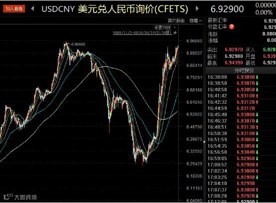 10月19日,在岸人民币价格收盘价6.9290。前期新高是2016年12月28日6.9666。突破则将创下10年新低。