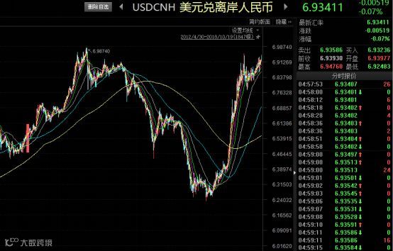 10月19日,离岸人民币价格收盘价6.9341,前期低点是2018年8月15日的6.9587,再早是2017年1月3日6.9874。这也意味着突破前期新高在即。