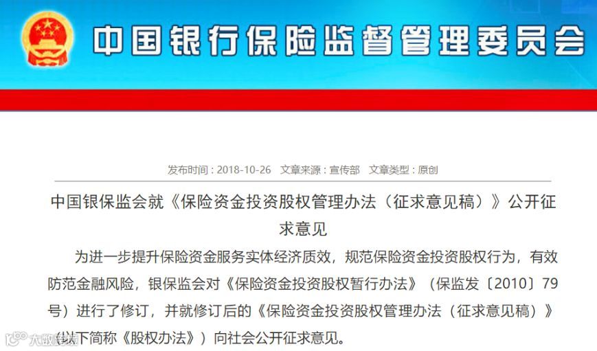 取消险资股权投资行业限制、放宽股权投资门槛……10月26日,中国银保监会对《保险资金投资股权暂行办法》(保监发〔2010〕79号)进行了修订,并就修订后的《保险资金投资股权管理办法(征求意见稿)》(以下简称《股权办法》)向社会公开征求意见。此举是为进一步提升保险资金服务实体经济质效,规范保险资金投资股权行为,有效防范金融风险。